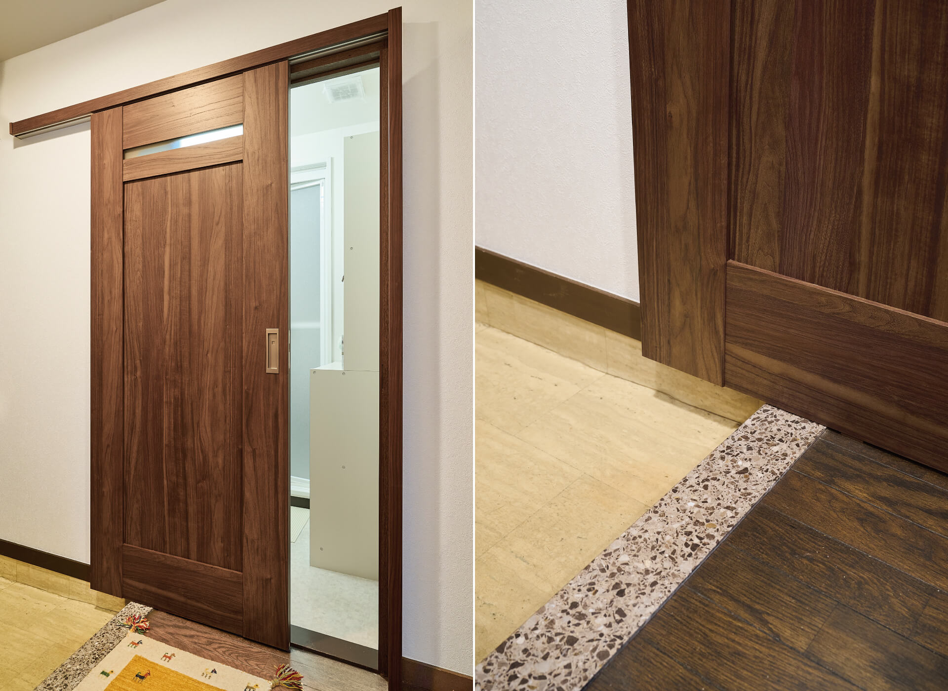 玄関横の洗面室の開き戸を引き戸に変更。扉を引き込む部分に玄関の段差や石の框がありましたが、上吊りタイプを選んで問題を解決しました。