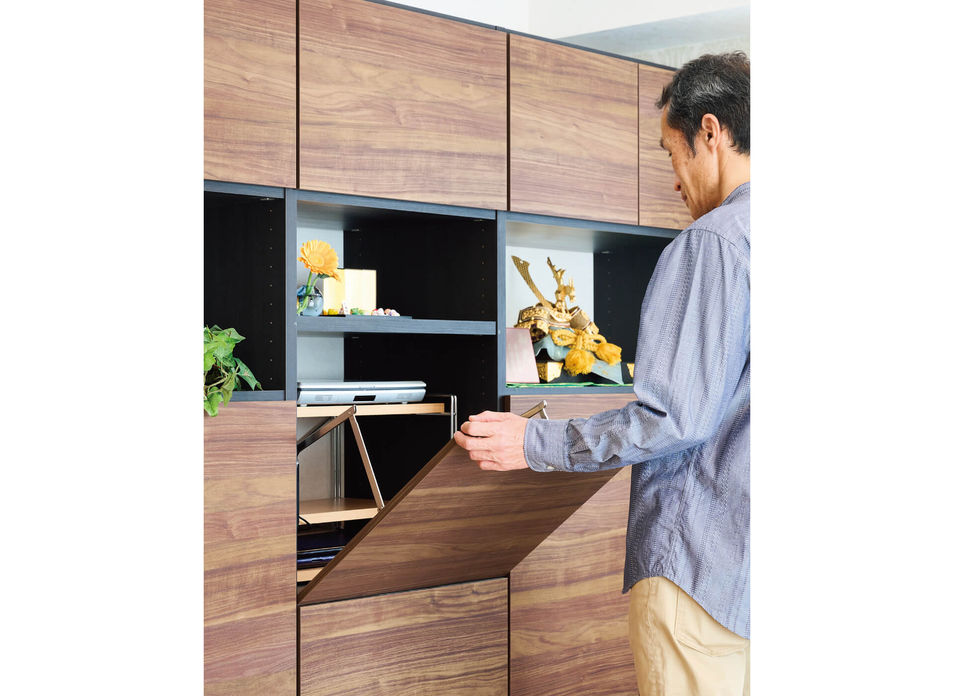 置き場所に困る掃除用具をリビングの壁面収納にまとめて収納し、動線をスムーズに。ロボット掃除機は充電しながら収納できます。