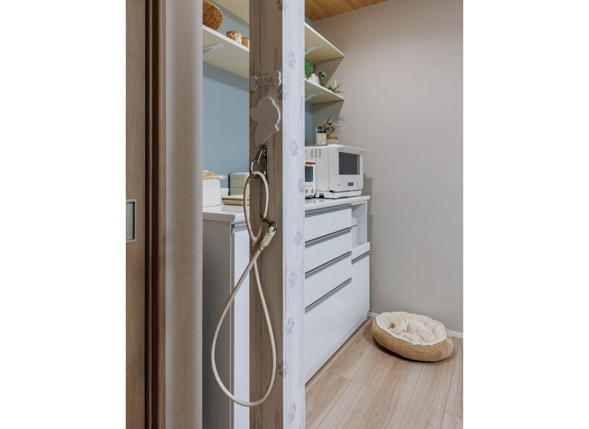 もともとあった物入れを撤去し、新たにカップボードを設置。柱にはリードフックを取り付けて、来客や留守番の際も安心。肉球がプリントされたクロスもポイントです。