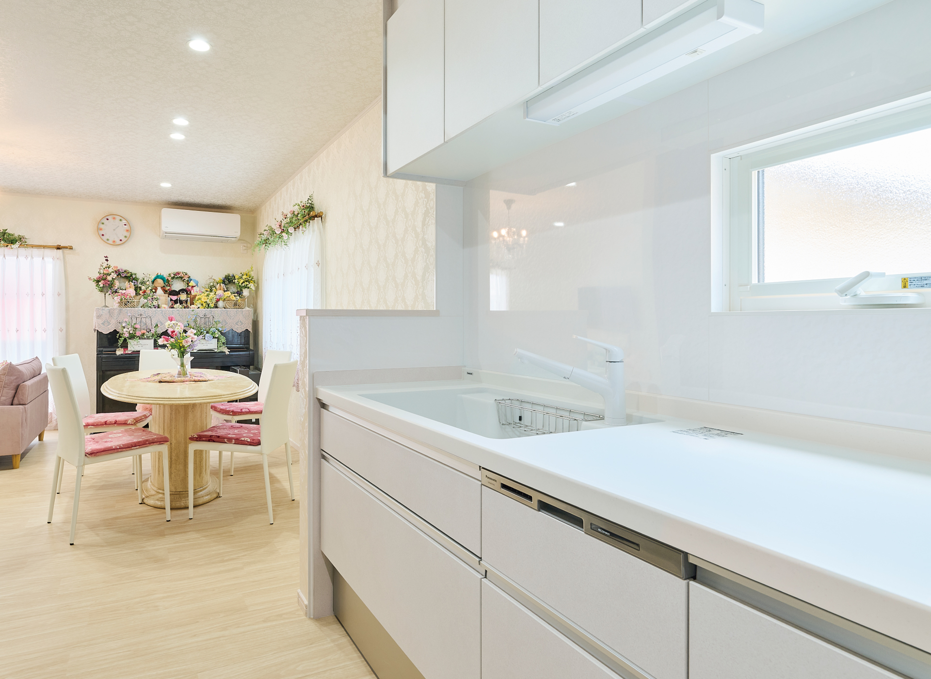 内装に合わせ、アースホワイト色をセレクトされたキッチン。「10年お掃除不要のレンジフードはお手入れが本当に楽で助かります」と奥様。