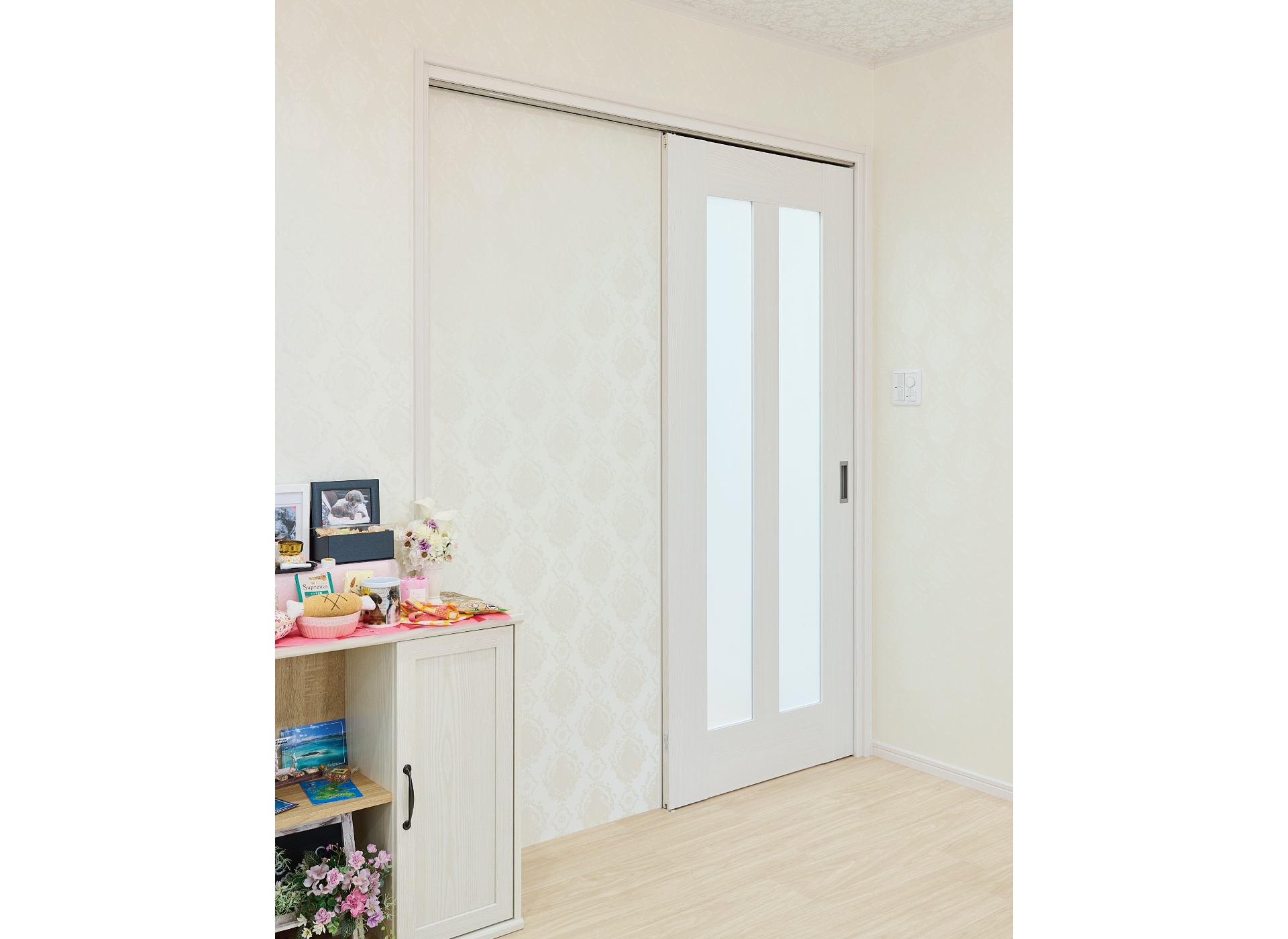 リビングの入口は全体のデザインテイストに合うようホワイトアッシュ色の引き戸に変更。床にレールがない上吊り式なので見た目もすっきり。