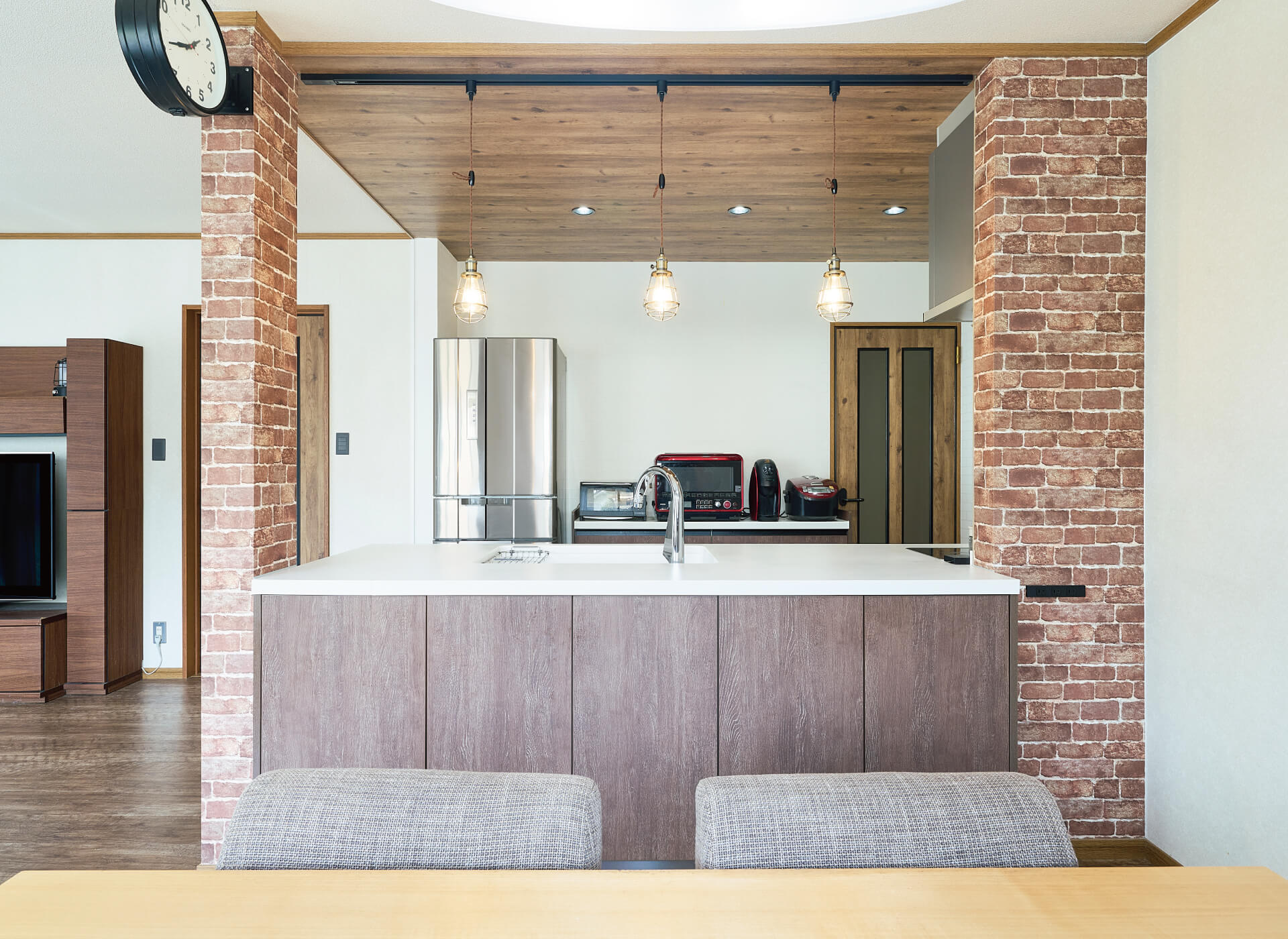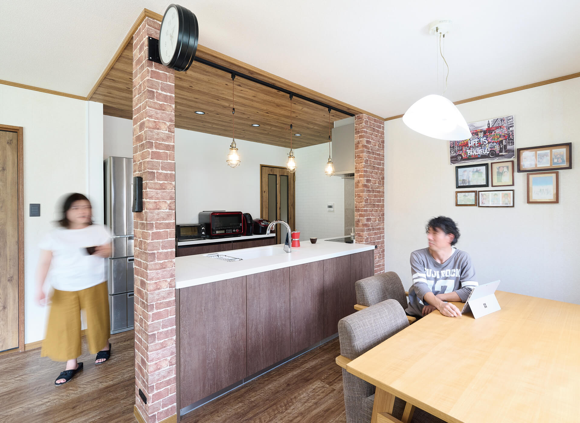 構造上外せない柱をレンガ調クロスで化粧して、インテリアのアクセントに。天井に木目パネルを貼ってダイニングとゆるやかに仕切り、あたたかみのある空間に仕上げました。