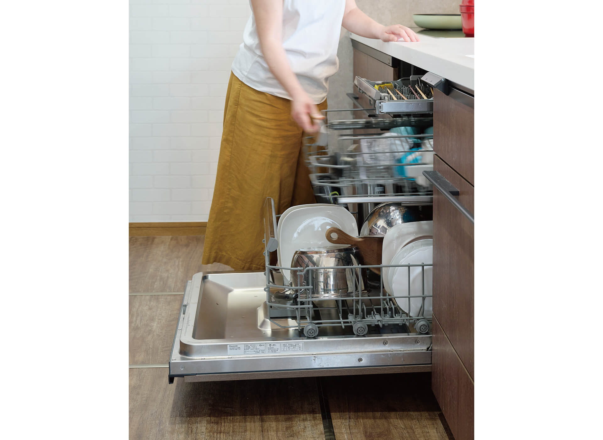 リフォームのきっかけになったフロントオープンの食器洗い乾燥機。食器から調理器具までまとめて洗える大容量で、洗い物がぐんとラクに。