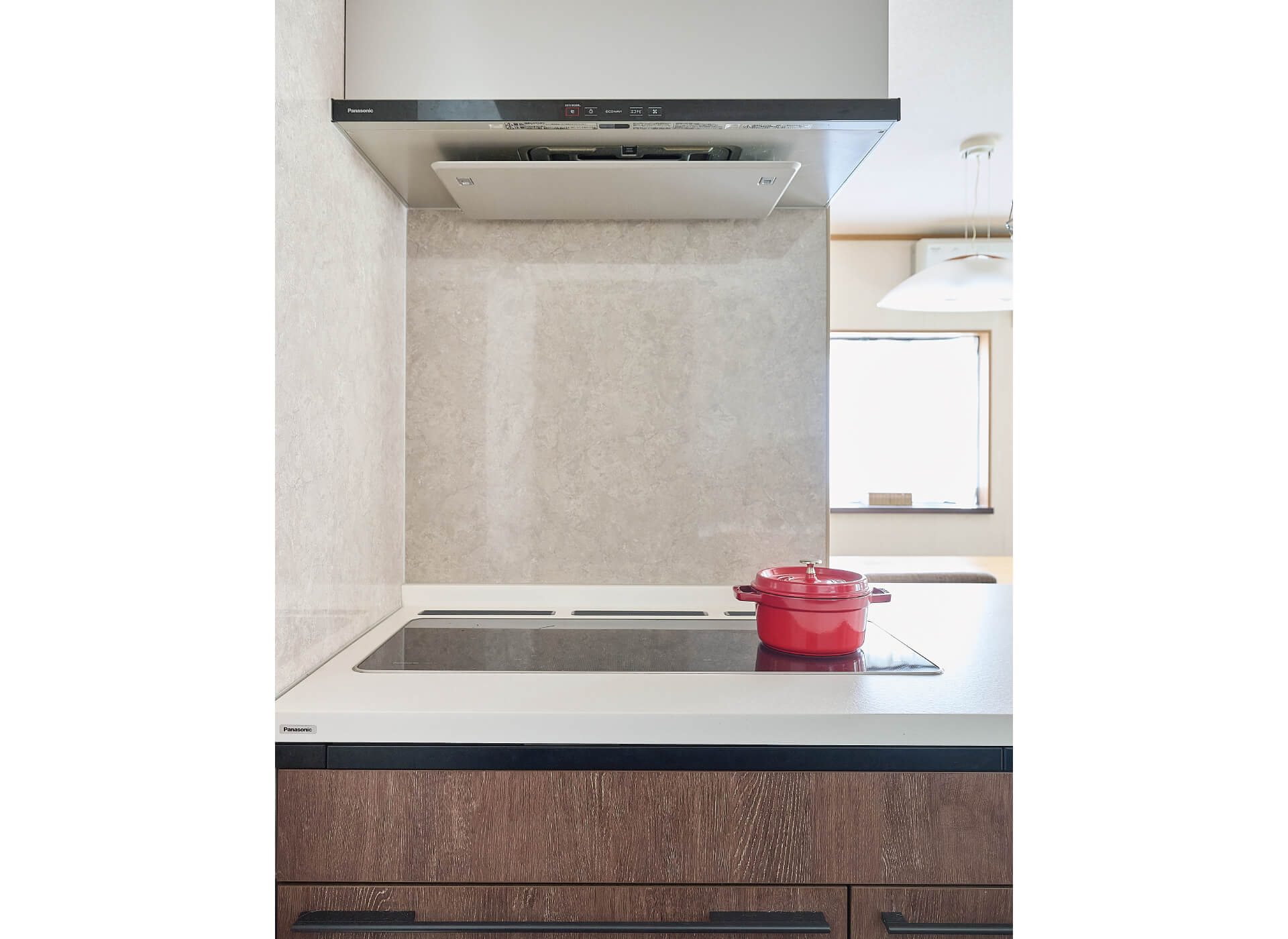 使いやすい3口横並びのIHは、フラットな形状でお皿などを置きやすいのも魅力。掃除のストレスがないレンジフードも奥様のお気に入り。