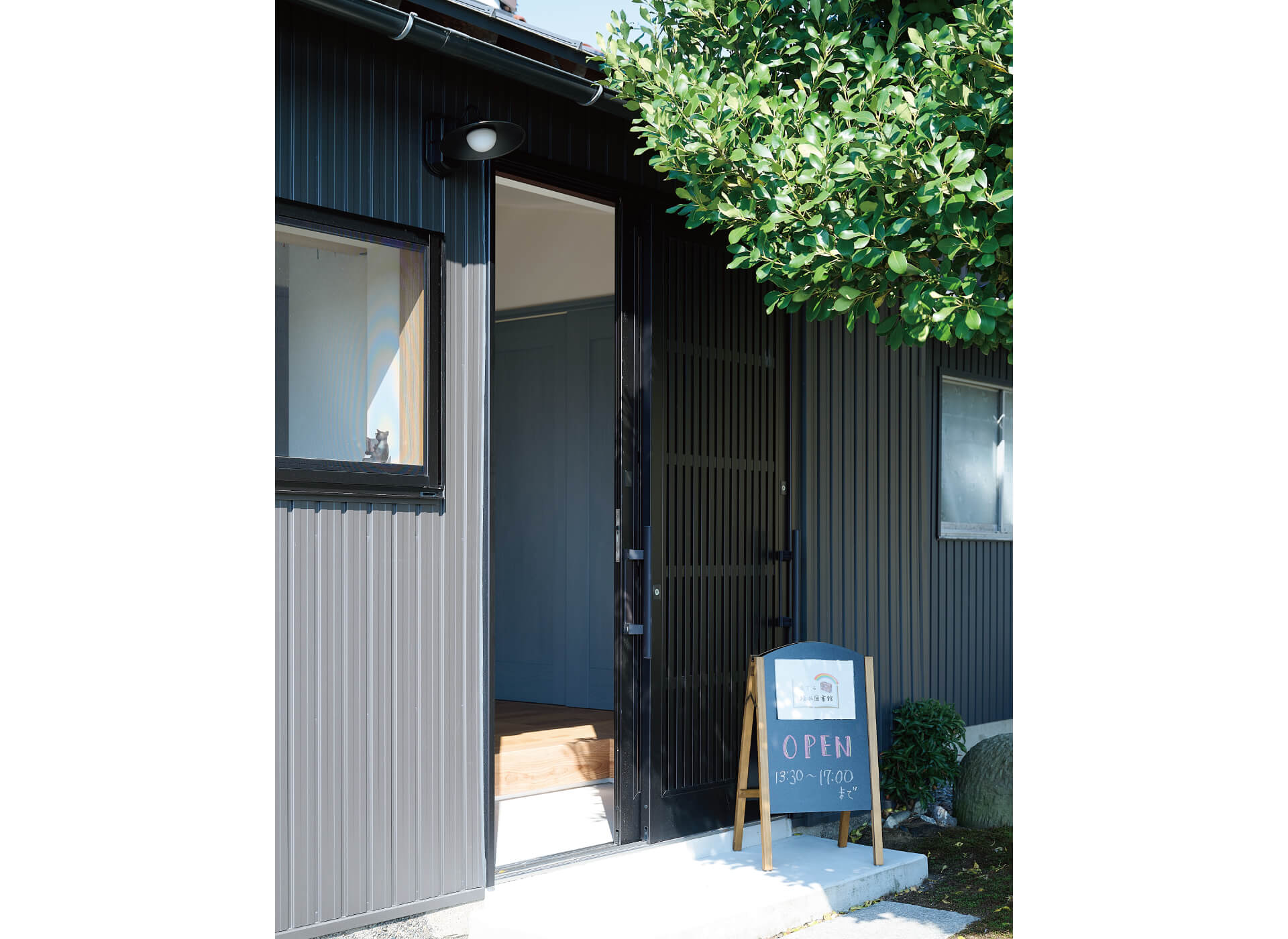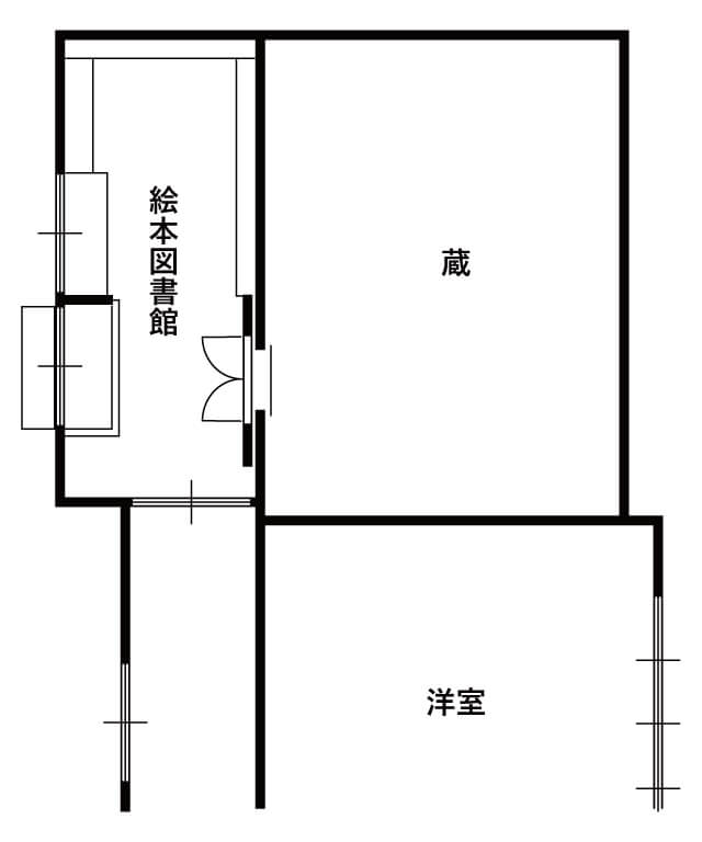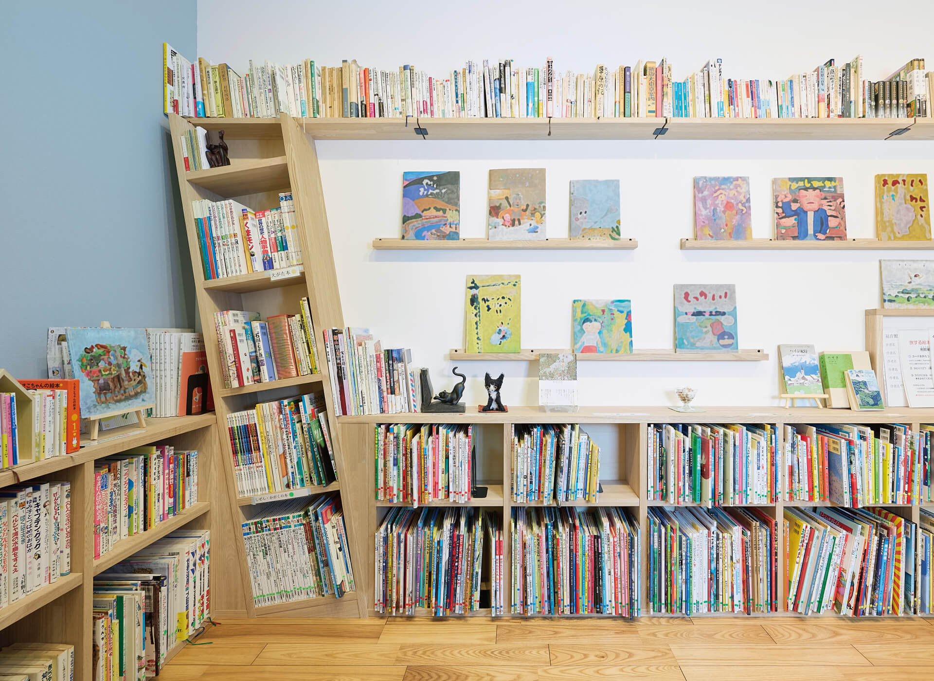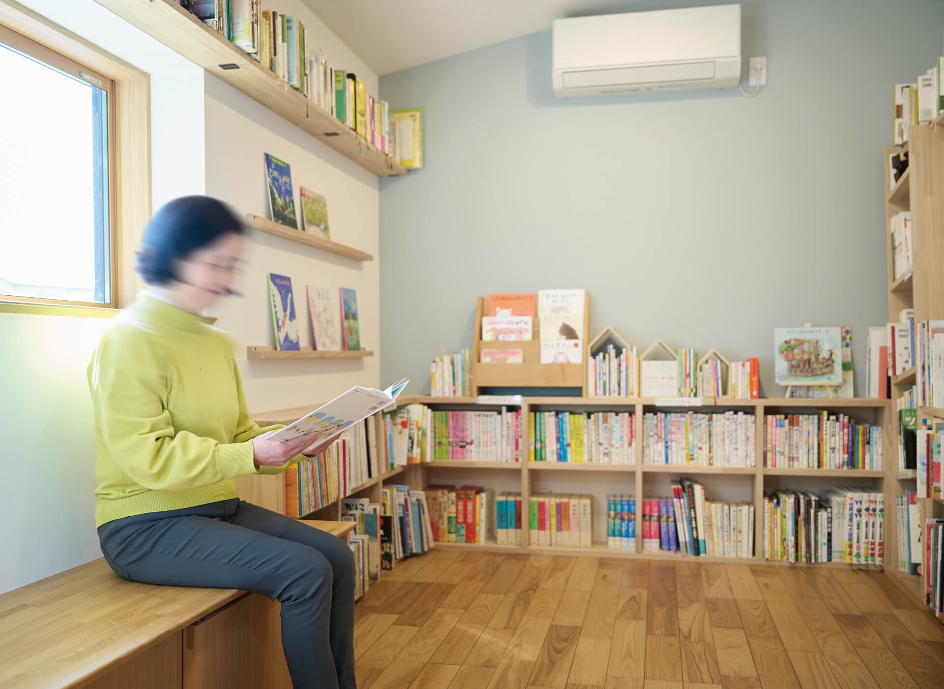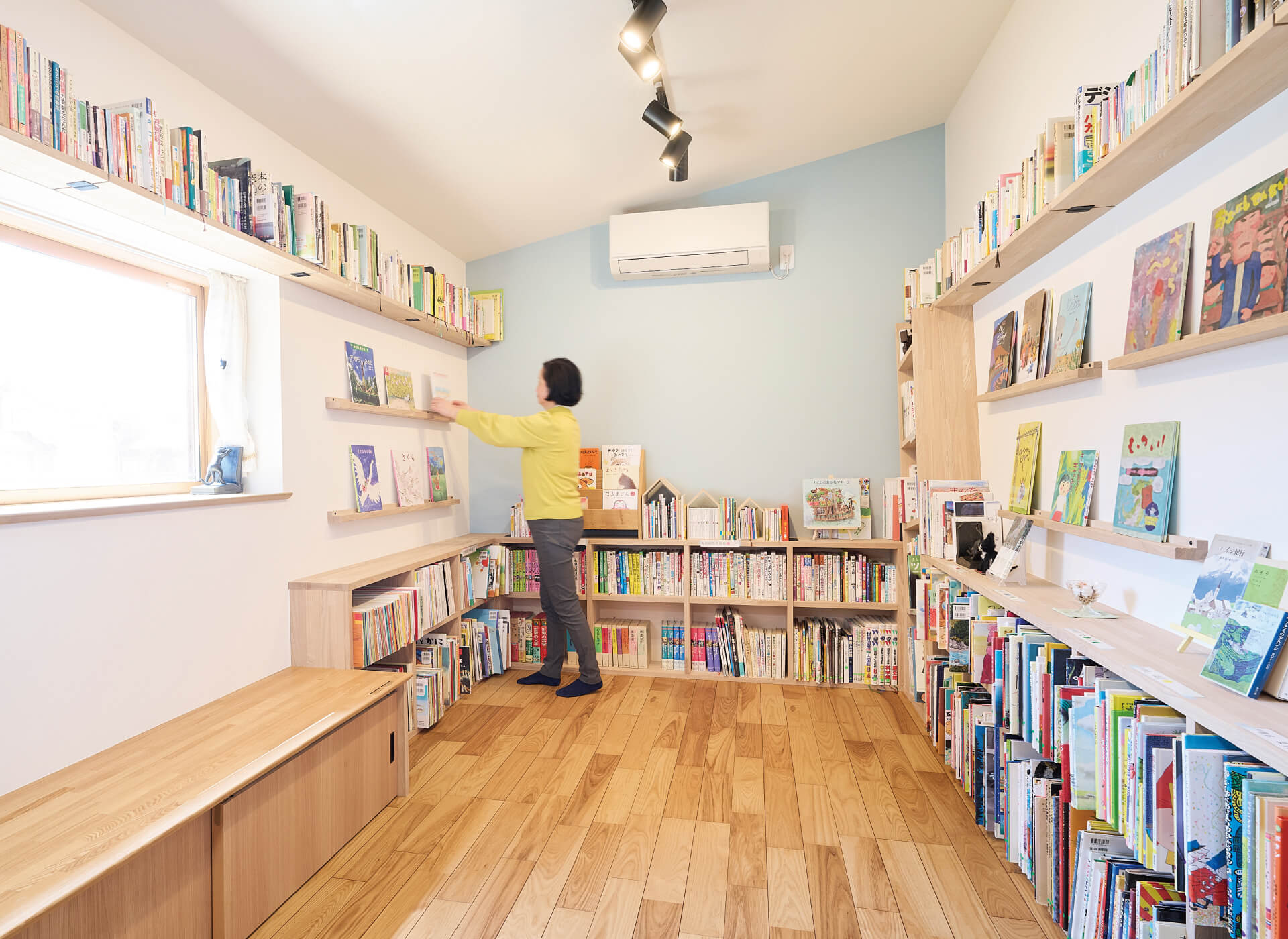 大好きな絵本を集め、将来は小さな図書館を開きたいと考えておられたF様。自宅を通らずに出入りできる蔵の前室を、ご近所の方も利用できる絵本図書館に。遊び心ある斜めの本棚、並んで座れるベンチなど、こだわりが満載です。本と人が出会う、あたたかな交流の場になりました。