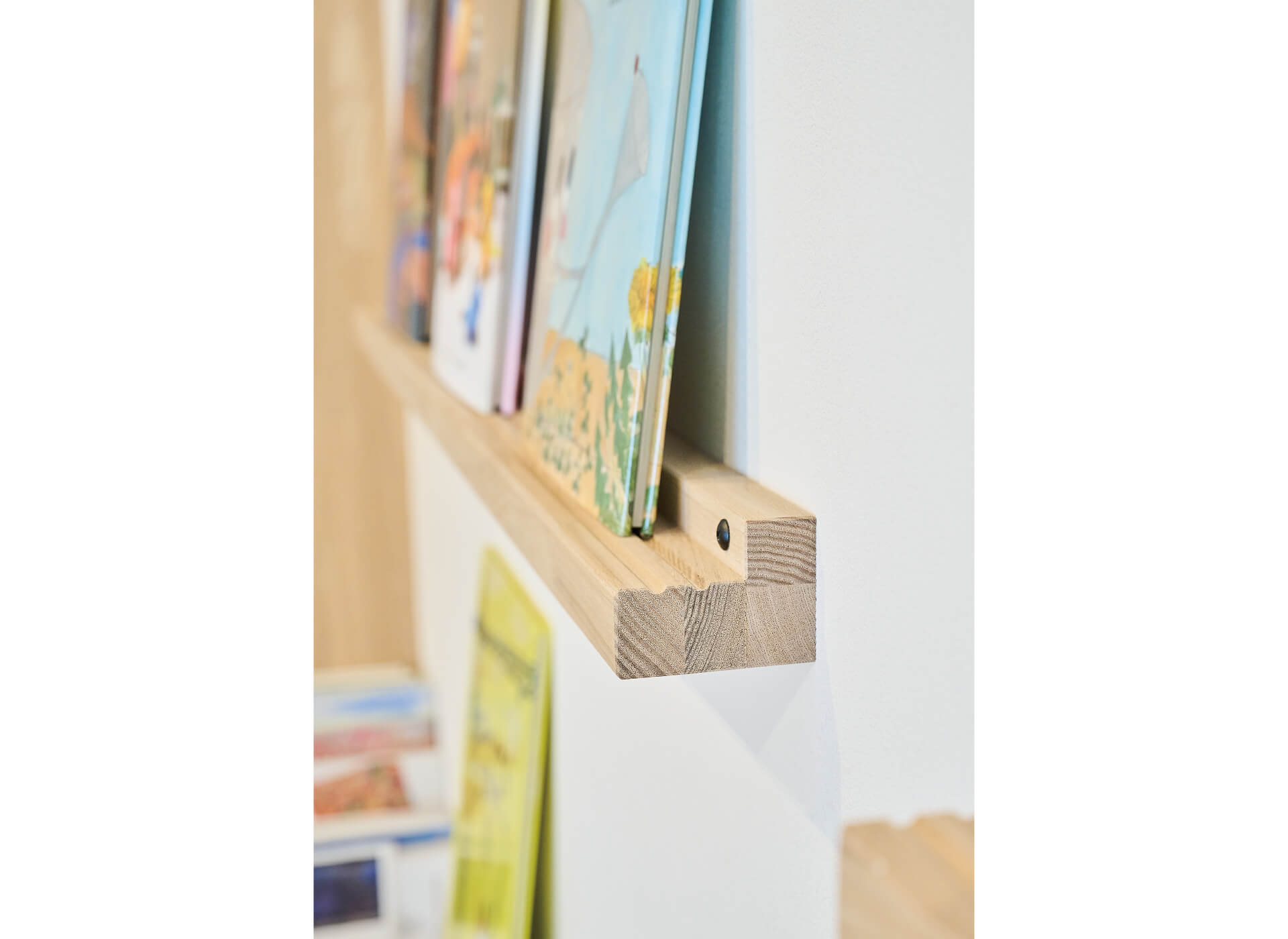 表紙をディスプレイできるバーは、本が落ちてこないよう溝を2本掘り、幅や奥行きも指定するなど、お施主様のこだわりが詰まっています。