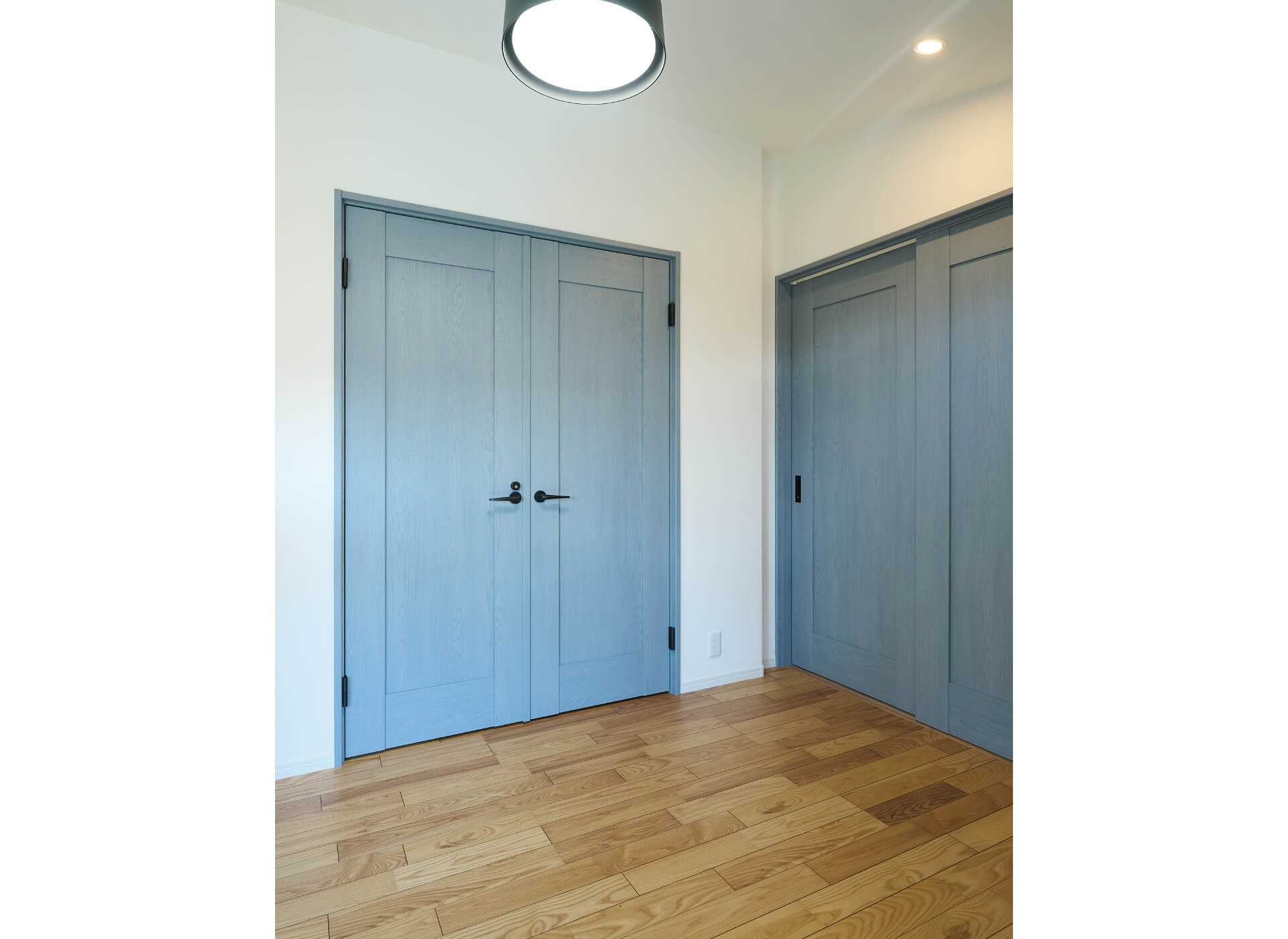 蔵の入口にあった段差をフラットにし、ブルーグレーオークの両開き扉に。自宅廊下への引き戸も同じ色柄で合わせ、統一感をもたせました。