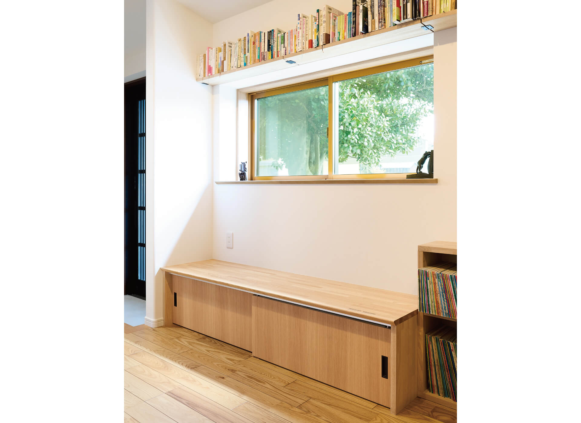 防犯と断熱性能を高めるため、新しいサッシに取り替え。窓下のベンチでは、腰掛けながら心ゆくまで本を楽しむことができます。