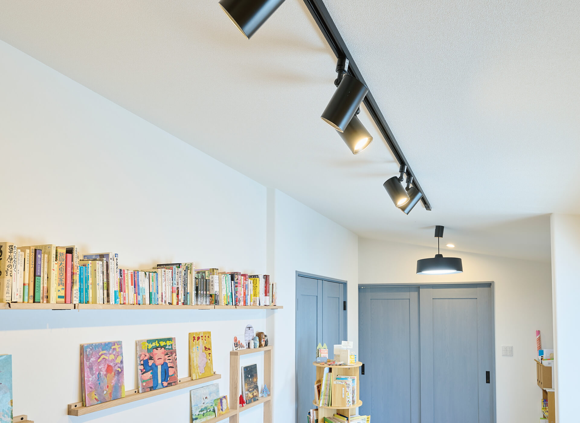 ダクトレールを設置し、必要な場所に光を当てながら落ち着いた雰囲気に。穏やかな陰影が本の表情を引き立てます。
