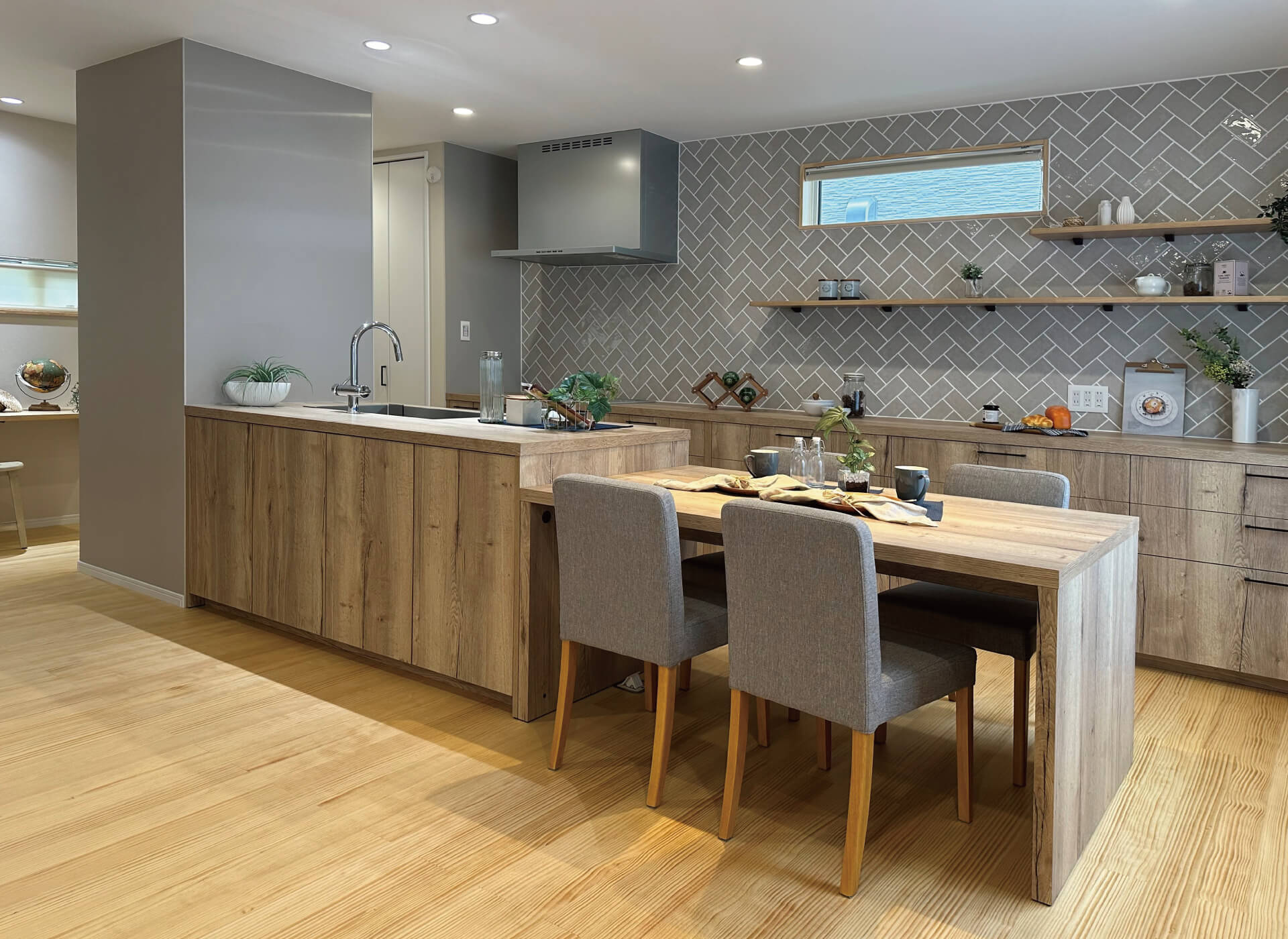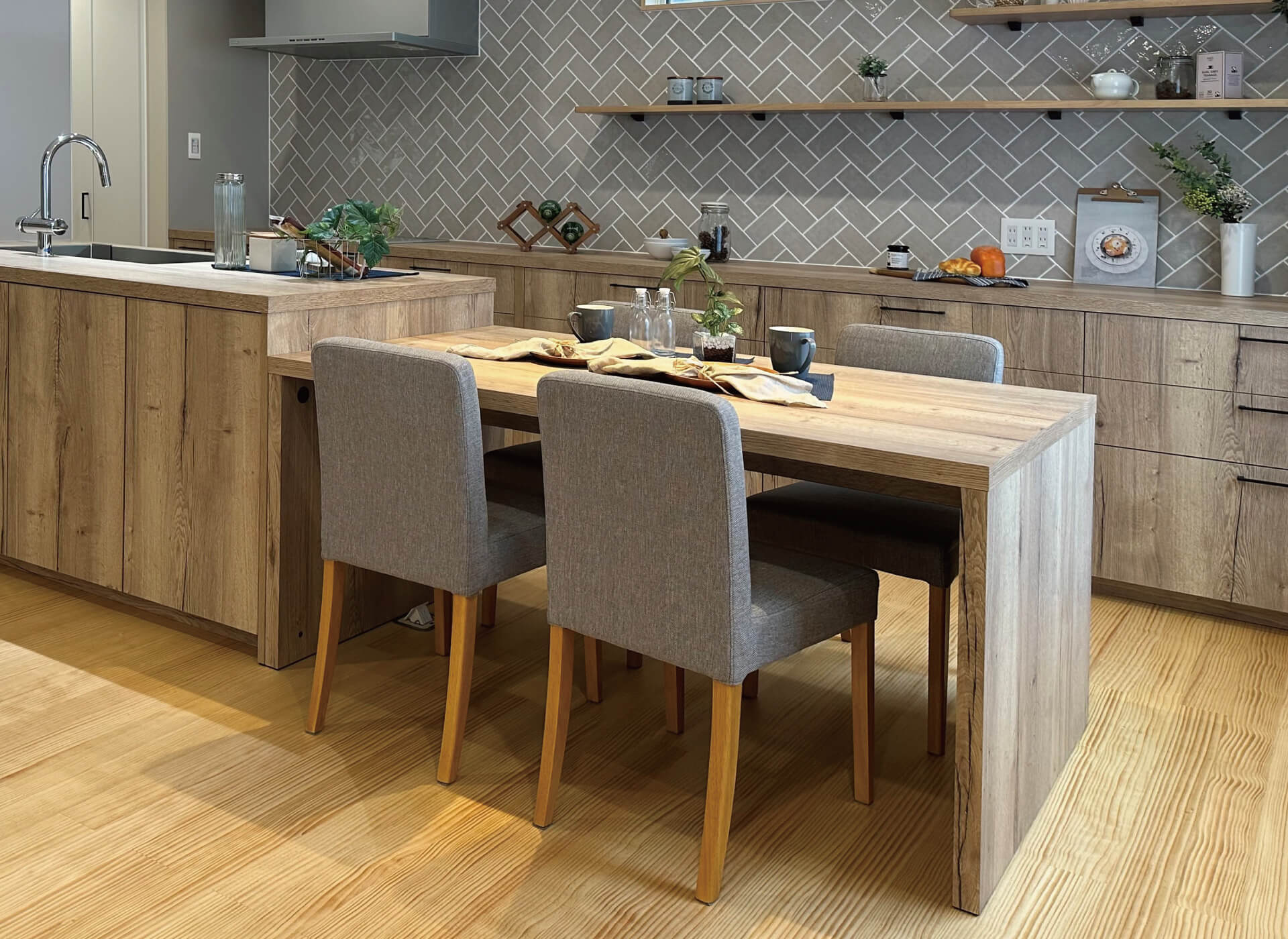 シンクとコンロが向かい合ったセパレート型は調理動線がコンパクト。横並びのテーブルへさっと配膳できます。