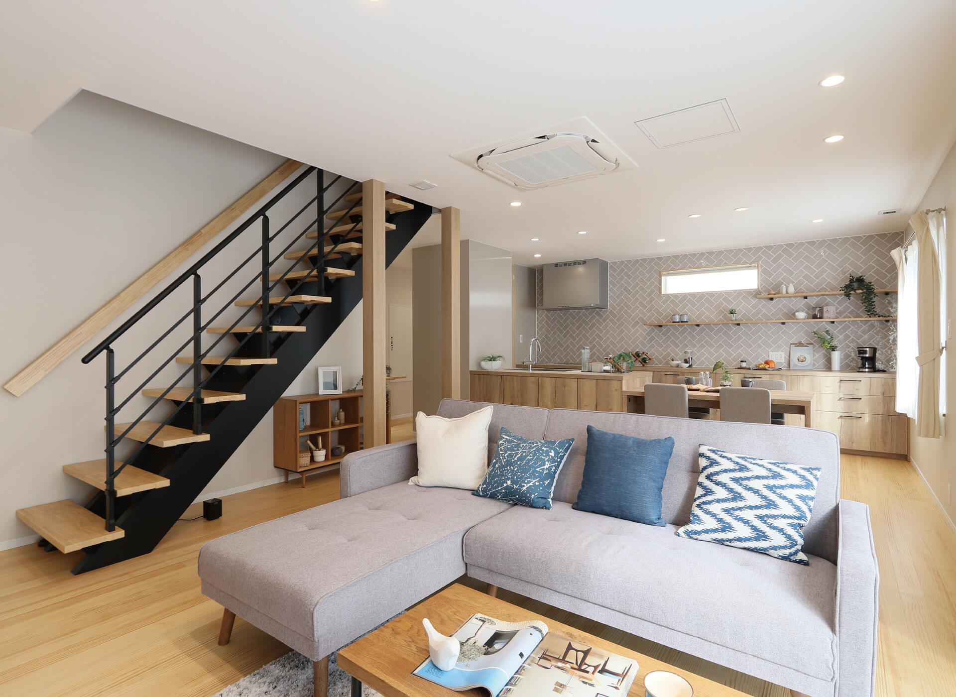 スケルトン階段で抜けをつくった、開放感のあるリビング。お子様がのびのび遊べる広々とした空間です。