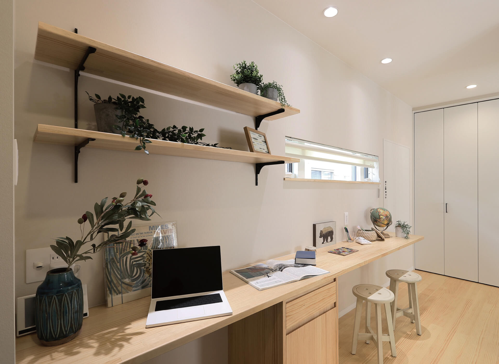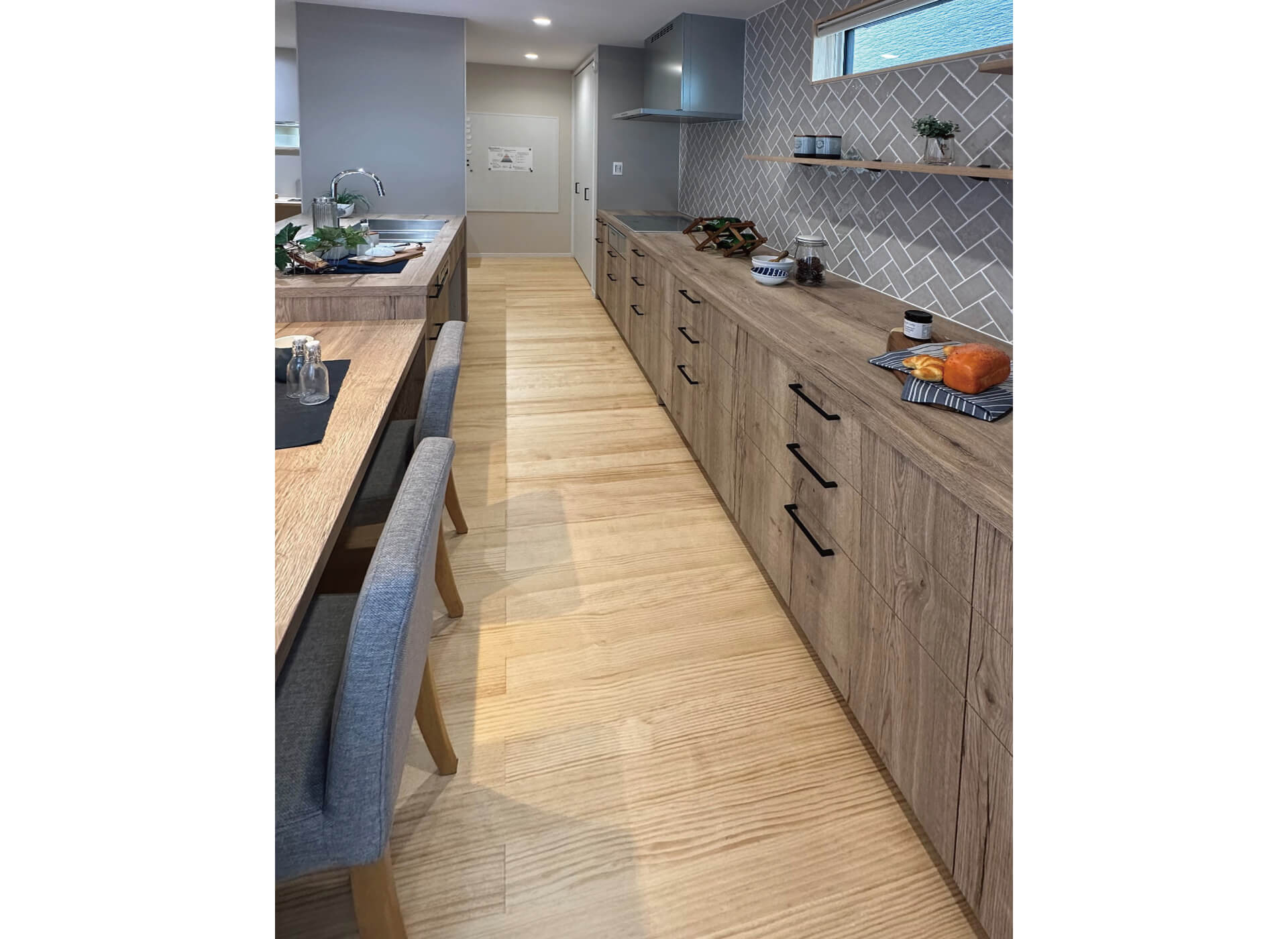 キッチン横に配置した3mのデスクカウンター。在宅ワークや、お子様の勉強を見守るのに十分な広さを確保しました。