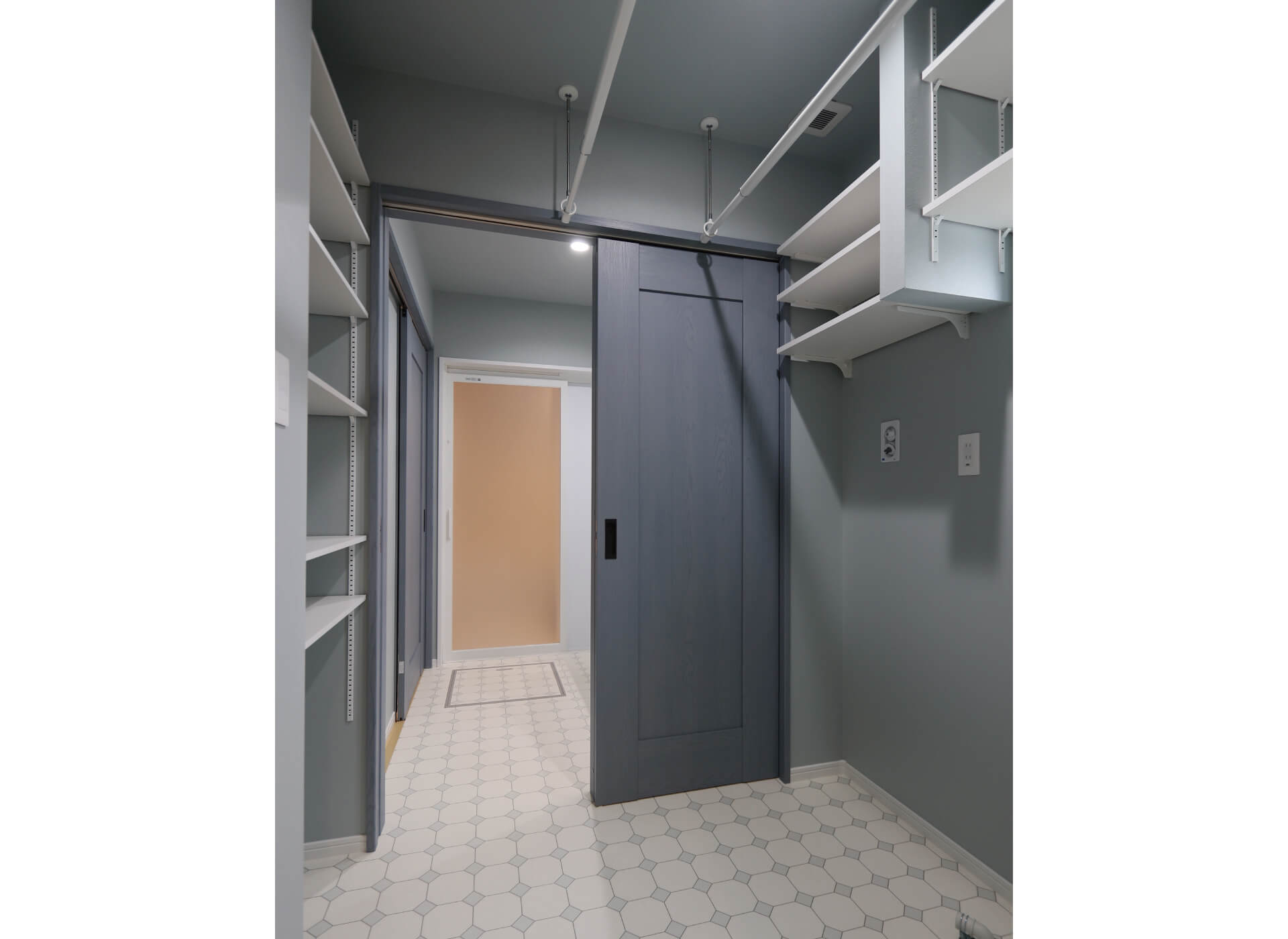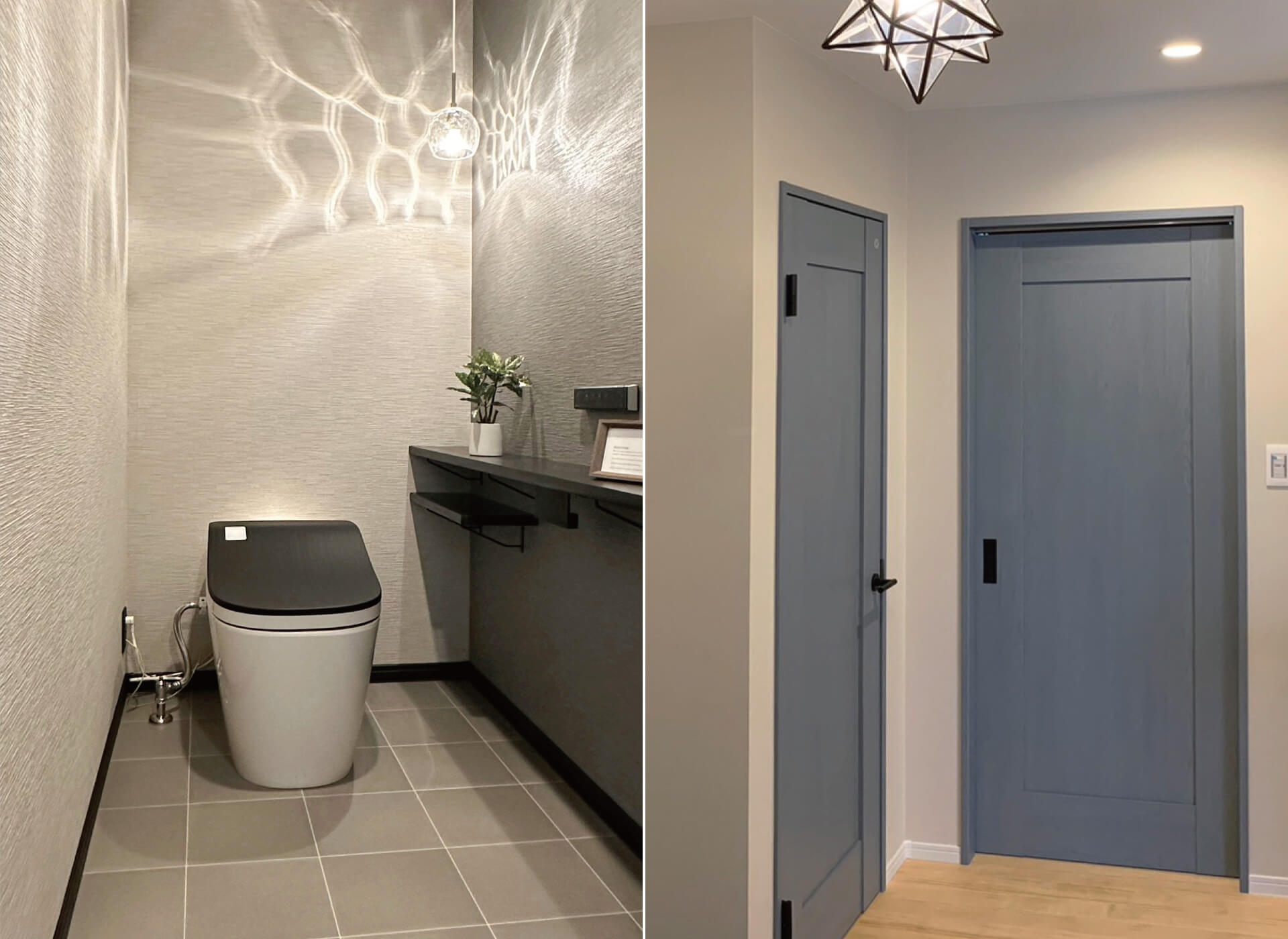 グレーのタイルと壁紙、ブルーグレーオーク柄の内装ドアでシックにコーディネイト。ペンダントライトの光が印象的です。