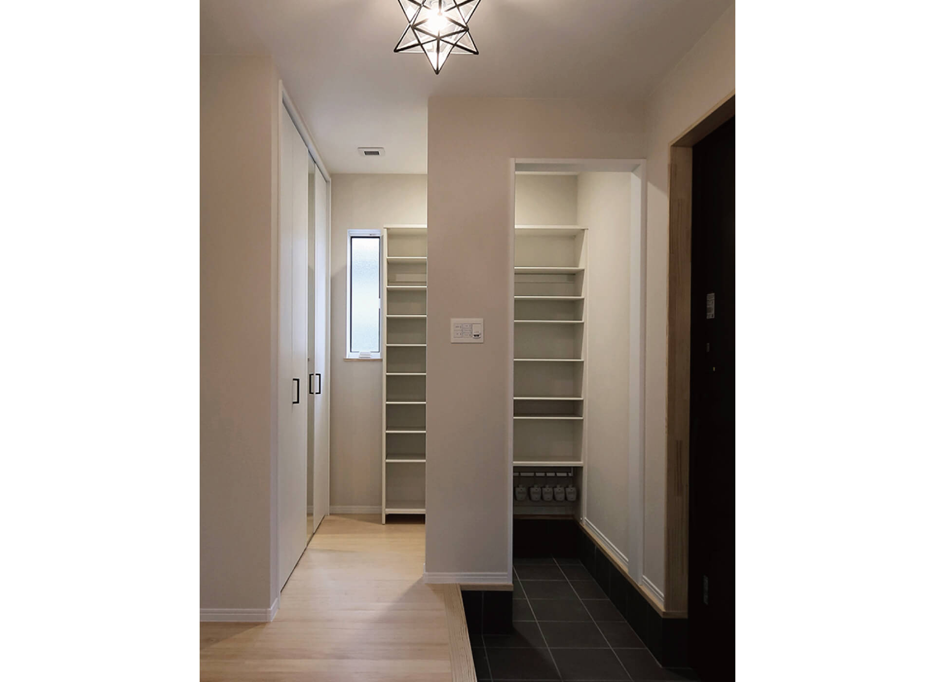 靴やアウトドアグッズが入る大容量のエントランスクローク。ミラー付きのクローゼットにはアウターを収納できます。