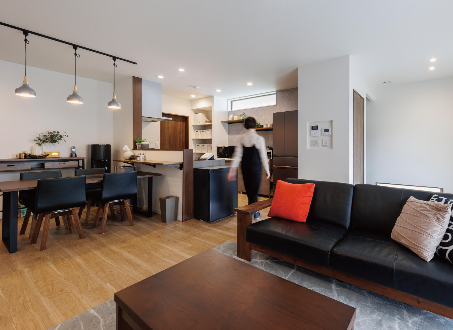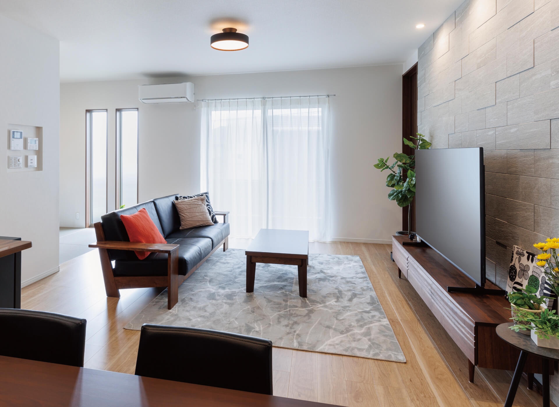 デザイン性の高いアクセント壁は施主様のお気に入り。上質な印象を与えるリビングの顔に仕上がりました。
