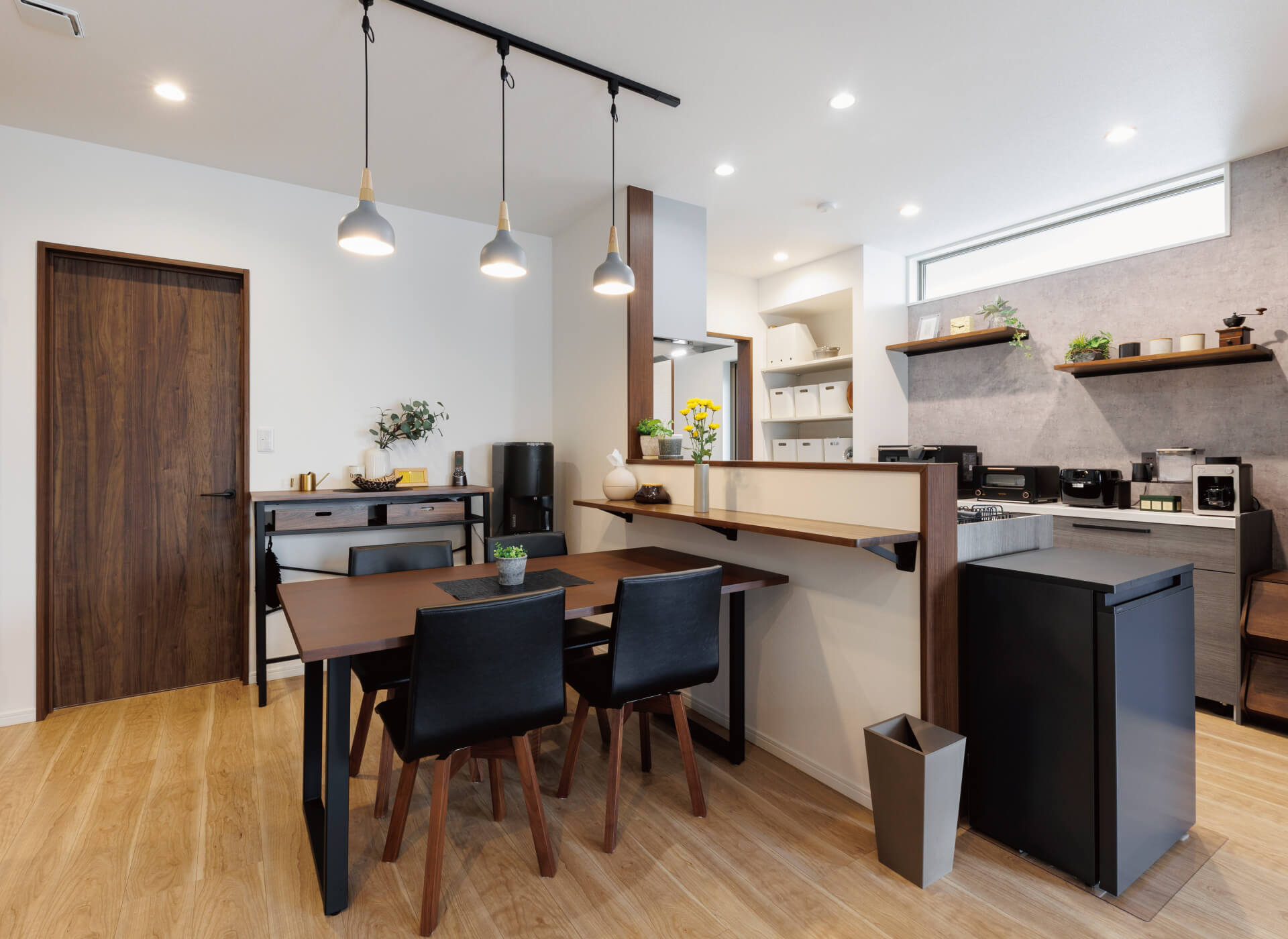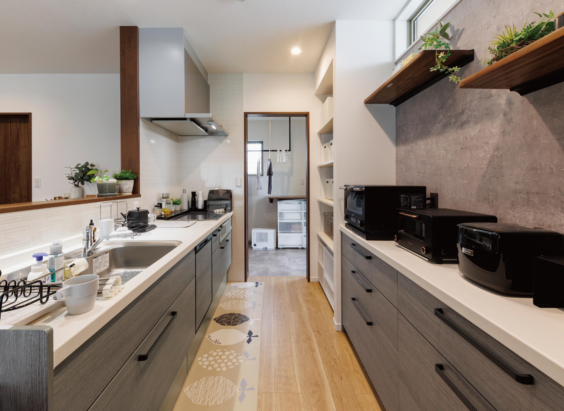 吊り戸棚の代わりにカウンターを設置して、見せる収納を楽しめるキッチン。ランドリールームに直接出入りできる家事ラク動線です。