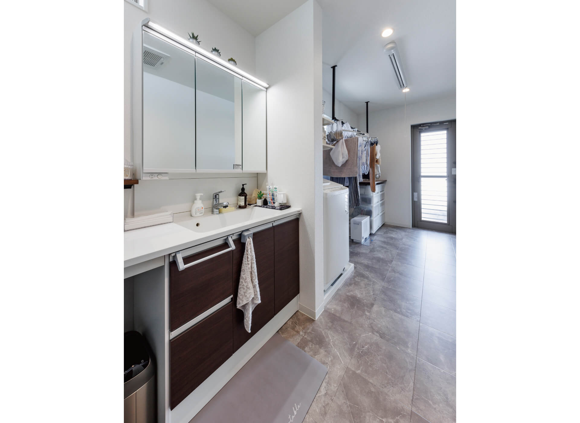 洗面室・ランドリールームは、脱衣室と隣接しているので洗濯がスムーズ。洗ったその場で室内干しができ、勝手口を出ると外干しも。
