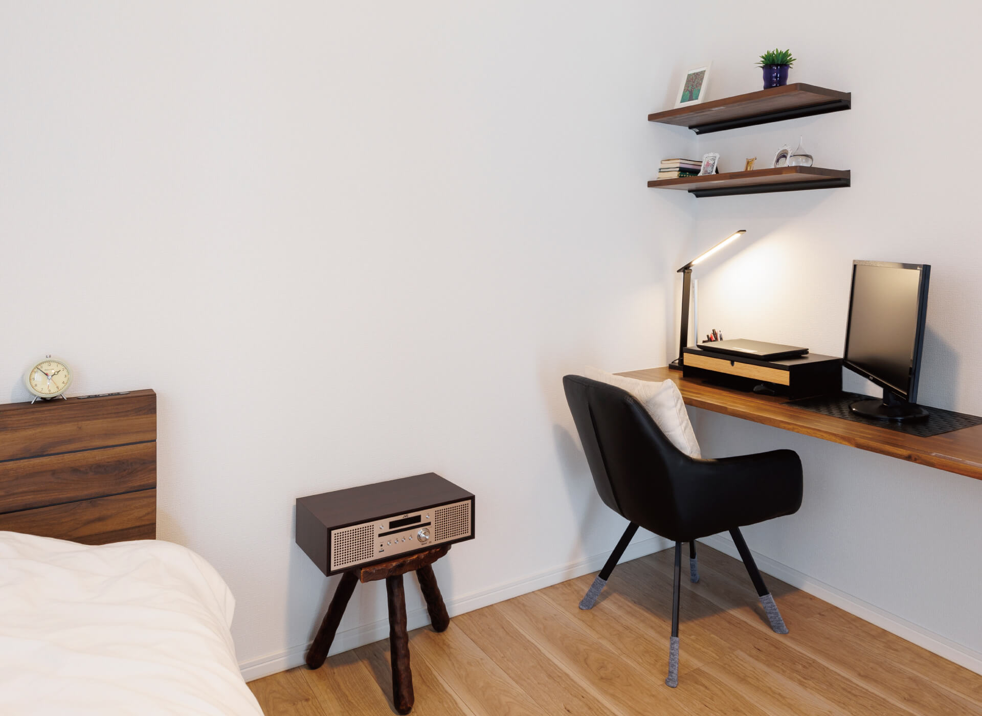 寝室に設けたワークスペース。飾り棚としても使える収納とデスクは、サイズの異なるインテリアカウンターを設置しています。