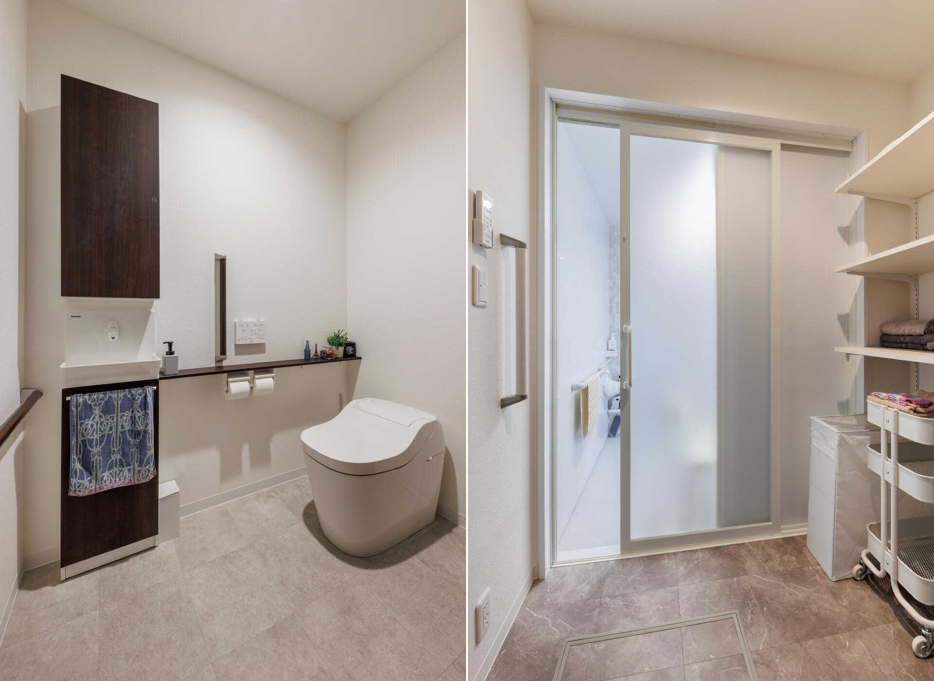 お母様が安心して使えるように、トイレと浴室、脱衣室に手すりを設置。出入口に段差のないバリアフリー設計です。