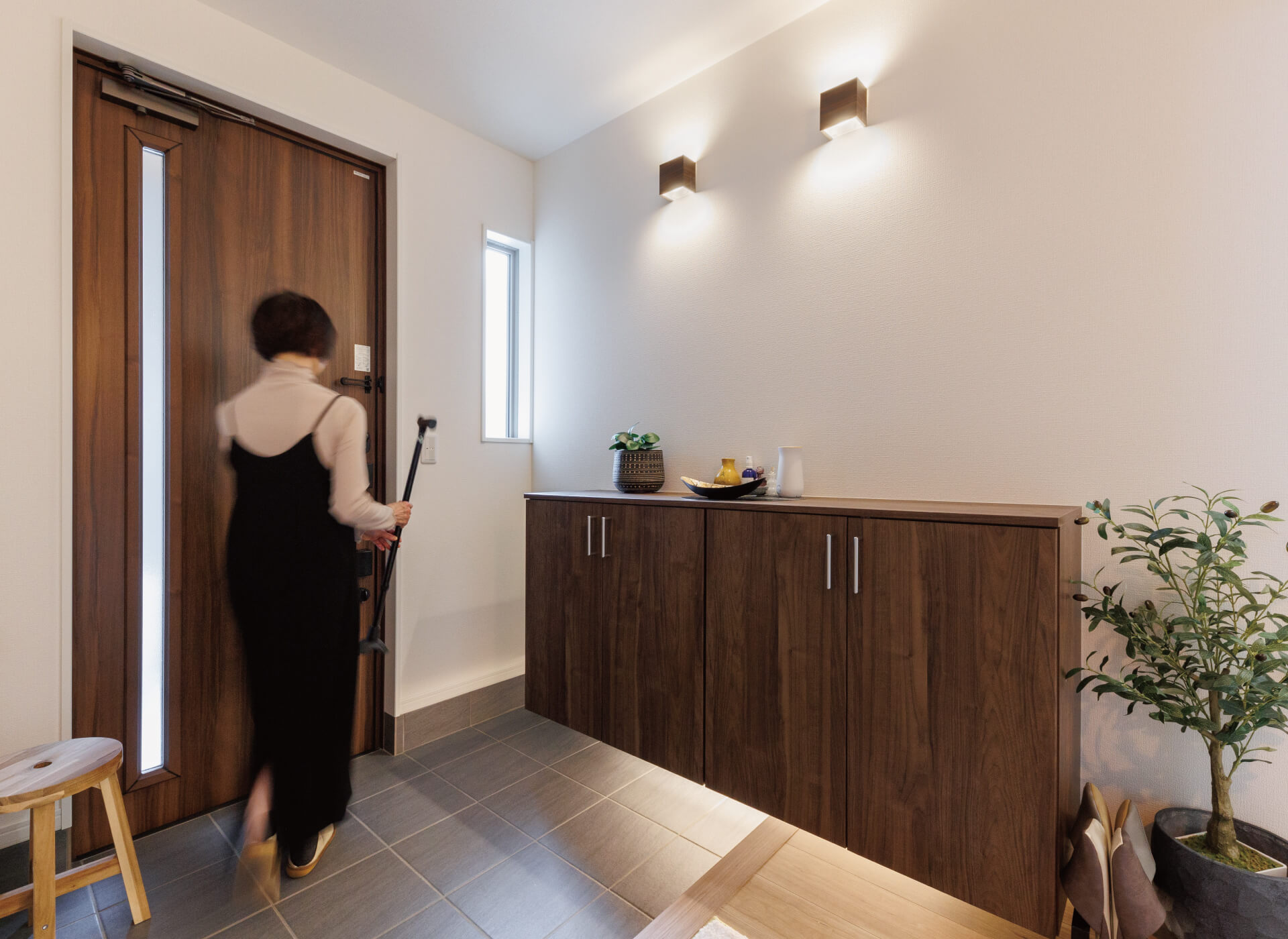 間接照明が素敵な雰囲気の玄関に、椅子や杖も置けて母が使いやすくなりました。仕事をしながら家事をしやすく、母も生活しやすい。理想通りの間取りになって満足しています。