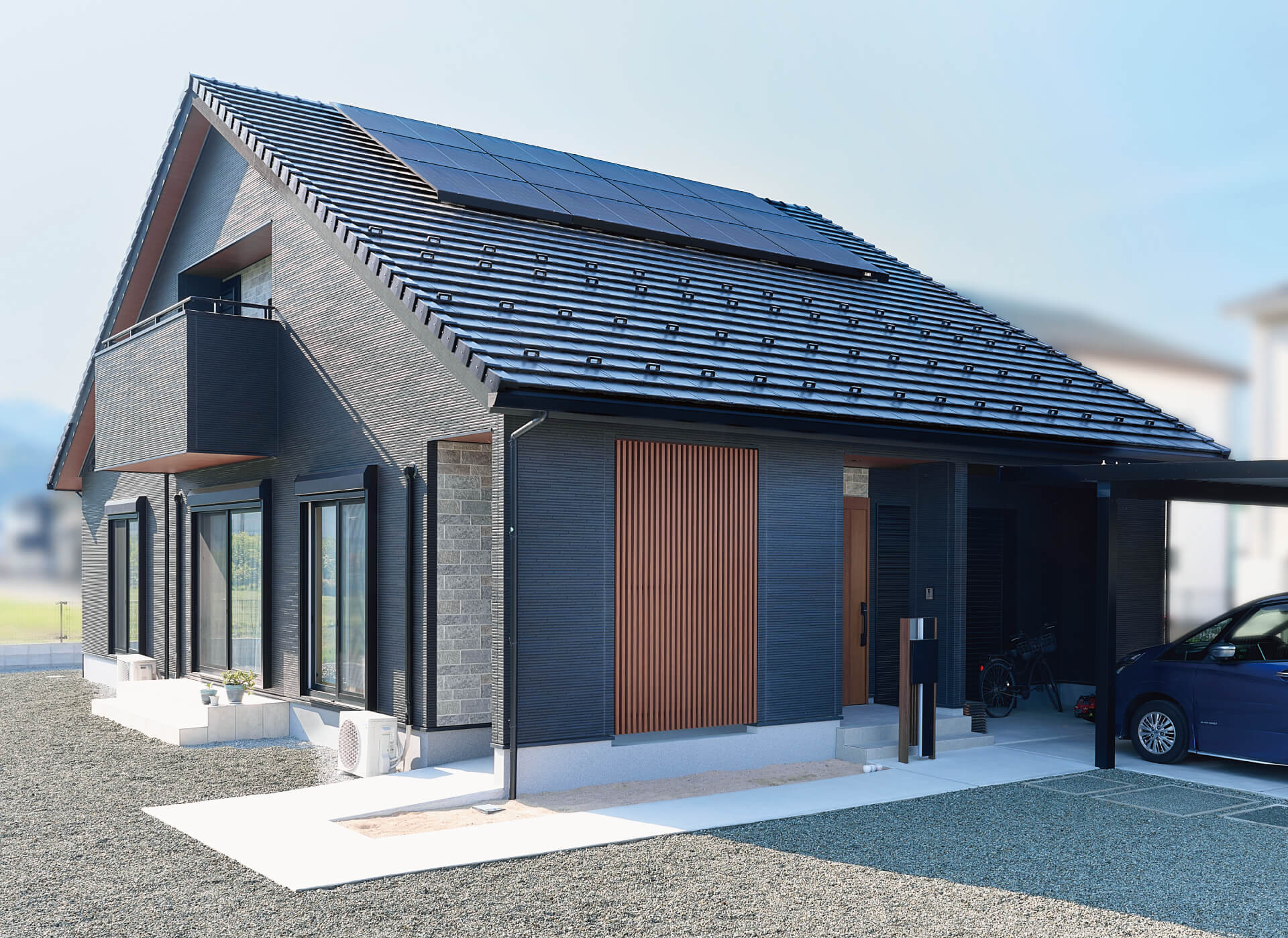 大屋根が美しい“平屋風”の住まい。外壁・屋根は黒を基調とし、格子・軒天・玄関扉にはあたたかみのある木目を採用。上質感あふれる印象に。