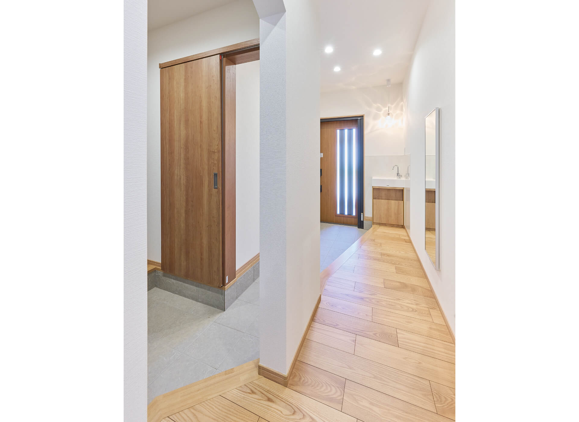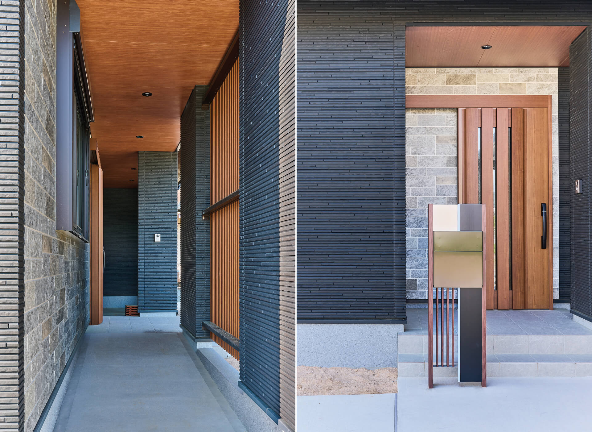 玄関へはステップとスロープのふたつの動線を確保。玄関ドアは車いす利用時や大きな荷物を持ち帰った際にも、使いやすい開口幅のゆとりある引き戸タイプに。