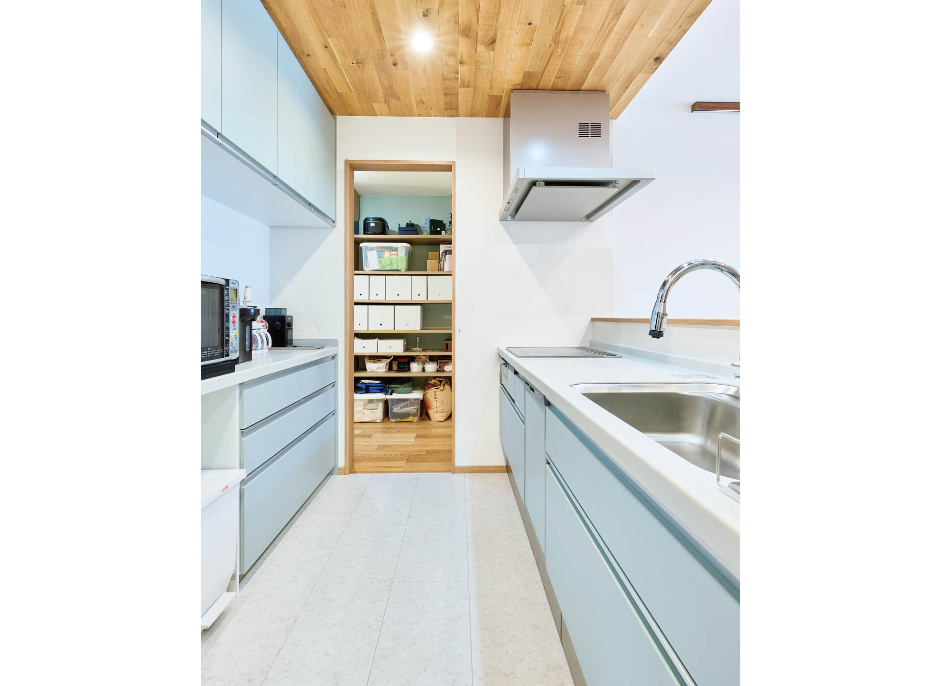 キッチンから家事室や脱衣室に直接アクセスできる動線を確保。キッチン扉色には奥様の好きなグリーンを採用され、スタイリッシュに仕上げられました。