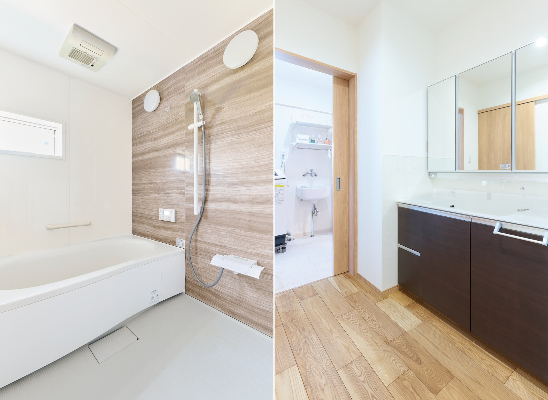 浴室や脱衣室、廊下幅は広めに計画し、介助のしやすさに配慮。洗面ドレッシングを廊下に設け、誰かが入浴中でも気兼ねなく使用できるように。
