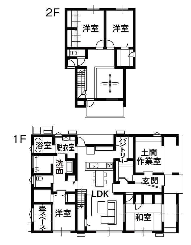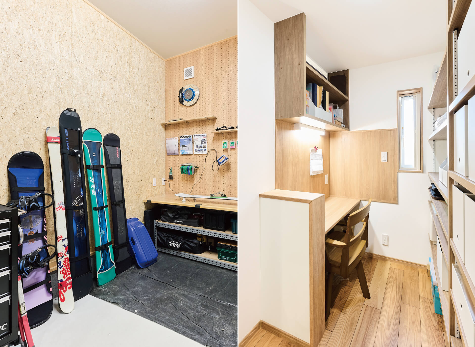 玄関横の土間作業室や玄関収納、キッチンの動線上に設けた家事室など、ご夫婦それぞれが好きなことに没頭できる“おこもり空間”を設けました。