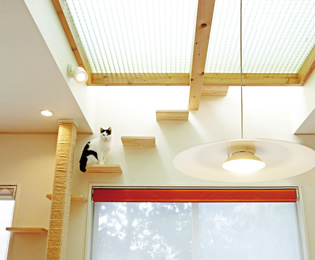 リビングサイドには猫の運動のためのステップと爪とぎのために荒縄で巻いたタワーを。