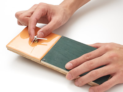 ムーブメントの先をタイルと本体の穴にはめて、板の裏側にボンドでくっつけます。