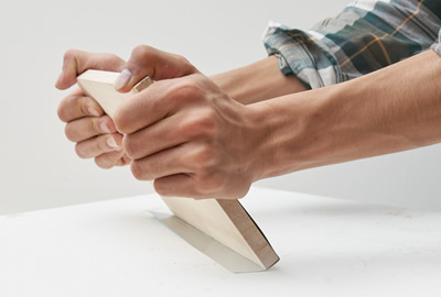 ブリキシートを棚板寸法に合わせて折り曲げます。端材で押さえて角をしっかり出してください。