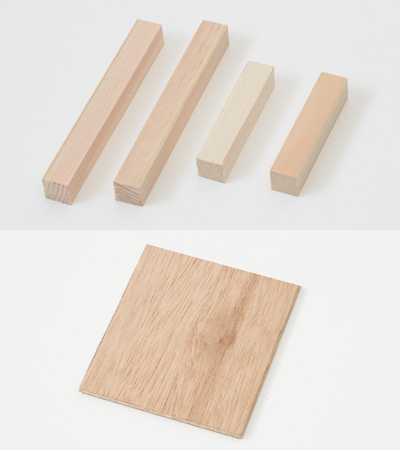 長方形の木枠は、長短の角棒4本でつくります。木枠は10個必要なので、各サイズ20本ずつの角棒にカットします。底板用としてベニヤ板2枚もカットします。