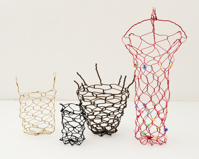 4本のワイヤーを束にして、ねじらせます。持ち手部分は手で曲げてひっかけらるようにし、端はラジオペンチで丸めます。