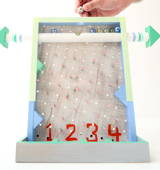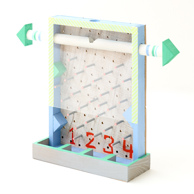 オリジナルのビー玉転がしの出来上がり。クギや障害物の配置を工夫して、ビー玉がおもしろく転がるようアレンジしてください。