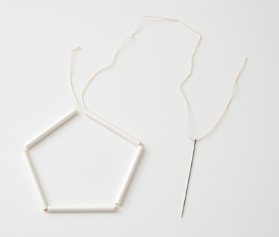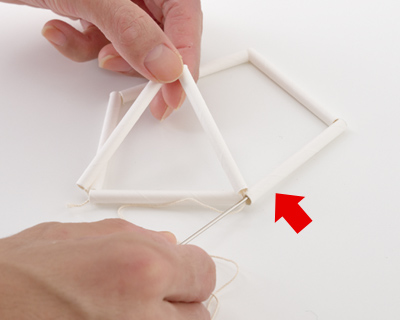 ストロー2本で3角形をつくり、5角形の角に結びつけます。