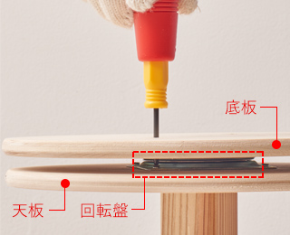 底板の裏面からドライバーを貫通穴に差して回転盤をビス留めし、天板に取り付けます。