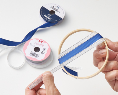 刺しゅう枠にリボンを十字に渡したり、くぐらせて交差させたり。色や素材、幅違いのリボンを組み合わせると、変化を楽しめます。
