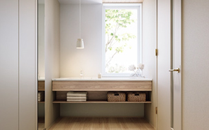 室内窓で明るく風通しのよい洗面室に