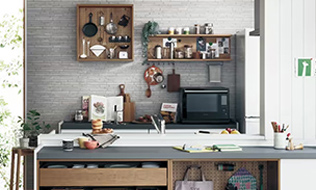 扉やカウンター、エンドパネルを内装ドアや床材と同じお気に入りのベリティス柄でカラーコーディネイトできます。