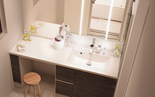 洗面台の左右にスキマがあると、どうしても水が垂れたりホコリなどで掃除がたいへんですよね。Wall to Wallプランの洗面は、壁から壁までぴったり納まるのが大きな特長。スキマがなく、美しく一体感のある空間をつくることができます。さらに、フロートタイプでカウンターは浮いたデザイン。下部が空いているので圧迫感がなく、広く感じられます。