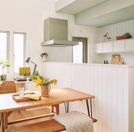 お気に入りのカフェをイメージして、キッチンの腰壁を木目調で仕上げてはいかがでしょうか。板を連続して貼り木目で美しく仕上げることができる羽目板。見た目がぐっとおしゃれになるだけでなく、汚れや傷に強い仕上げなのでお手入れも簡単です。
