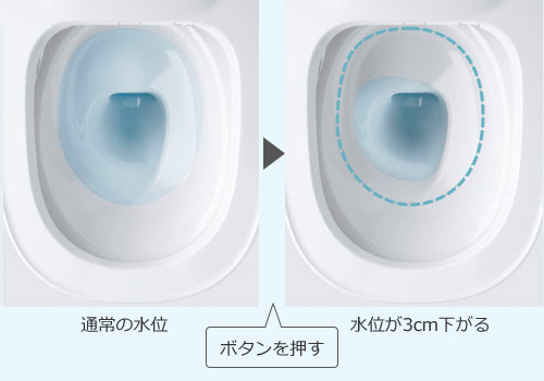 リモコンの「便器水位」ボタンを押せば、水位が約3cm下がります。