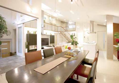 「家族でゆっくりくつろげる場所がほしい」という要望に応え、2階の子世帯LDKは勾配天井を活かした吹き抜け大空間に。天窓やサンルームから燦々と光が差し込み、風が通り抜ける、ここちよい家族の居場所ができました。若奥様がこだわったキッチンには、使いやすさの面からナショナルの「フィットアイ」を採用。キッチンの床は、傷に強くワックスがけも不要の「NEWオーマイティフロアー」です。「子供が大きくなったら、この広いキッチンで一緒にお料理したいですね」と若奥様は楽しみにしていらっしゃいます