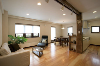 壁面の白と木のブラウンが美しく調和したLDK全景。