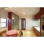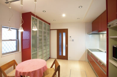 水回りを移動させ広々したキッチンに、若々しいレッドカラーが映えます。