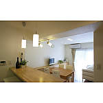 キッチンの位置は変えずに東南の和室を撤去し、広いLDKに。家事をしながらでも、お身体の弱いお母様をやさしく見守ることができるように、キッチンの隣にお母様の個室を配置しました。入り口の引き戸を開け放てばLDKと一体の空間となり、孤独感も解消されます。キッチンとダイニングの間の対面カウンターがリビング側からの視線の目隠しになるとともに、電子レンジやゴミ箱などを置ける