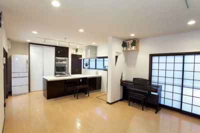和室とダイニングキッチンを一体化して広々したLDKに。2間を仕切っていた柱には、