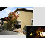 テラス越しに見えるシンボルツリーのヤマモミジがお互いのプライバシーを確保。外部の照明はすべてLEDをを使用していてアッパーライトに照らされた紅葉が昼とは違う印象です。