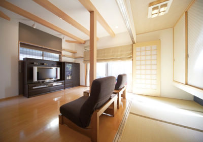 畳コーナーも含め、ナチュラルなイメージで統一したリビング。ディスプレイ用の棚を設けて、スポットライトで演出できるように